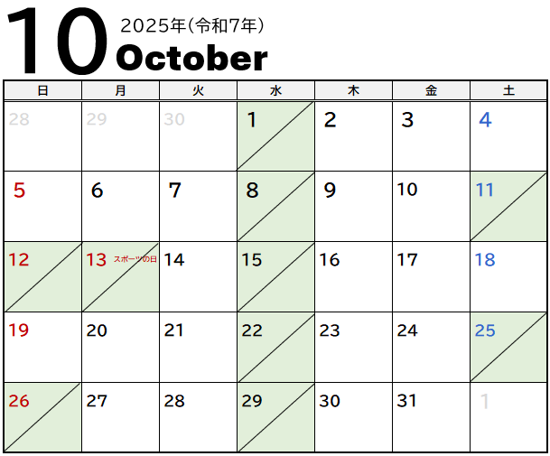 下記、2025年10月の定休日をご案内いたします。